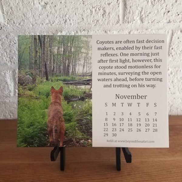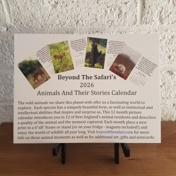 My 2026 Animals and Their Stories Desk Calendar brings you into the woods with twelve beautiful photos of New England’s wild animals living their lives in the forest, paired with unique explanations of the animal’s natural history or behavior in the present moment.