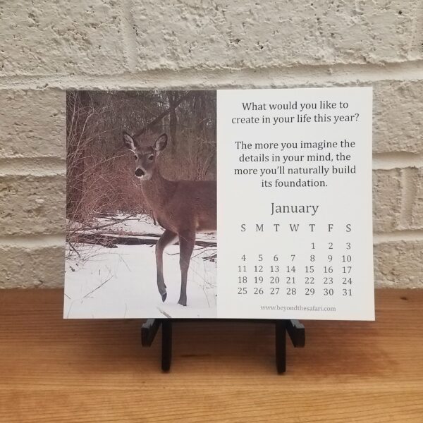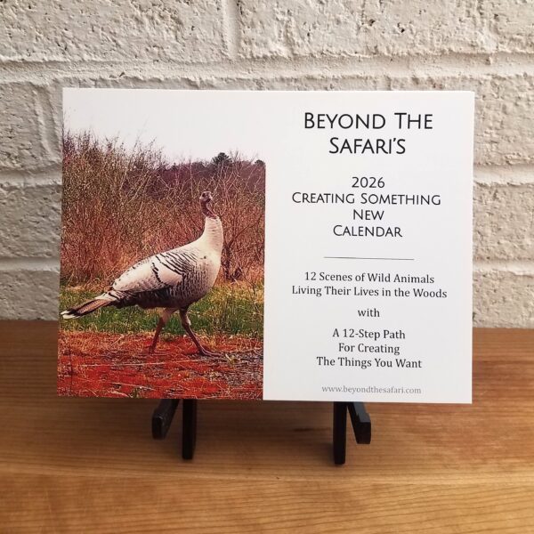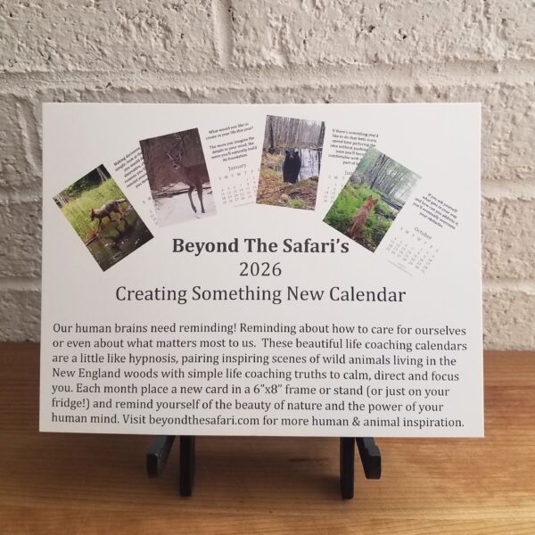 Our 2026 Creating Something New mindset calendar takes you on a 12 month journey of creating something meaningful for yourself while enjoying the beauty of New England wildlife.  Each month’s print pairs a unique image of an animal living its life in the woods with a different life coach truth or tool that helps you imagine what you want, take small steps to get there, overcome your obstacles and cultivate gratitude along the way.  A little like hypnosis, the visual and verbal combination helps calm, focus and inspire you in the direction you want to go.