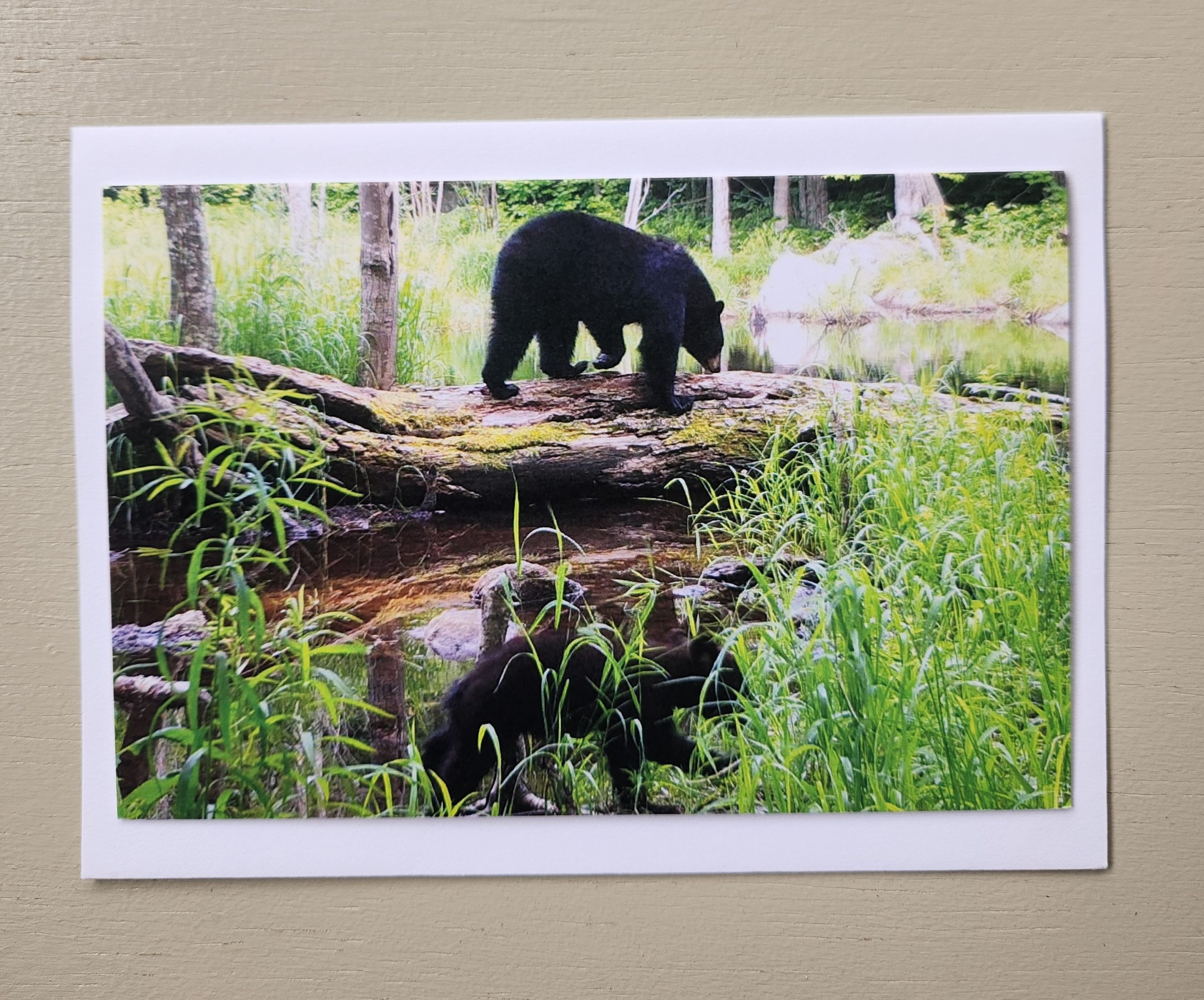 A black bear mother traveling on a log across water, with her cub following in the grasses along the shore. Printed on 4×6 premium card stock, envelope included.